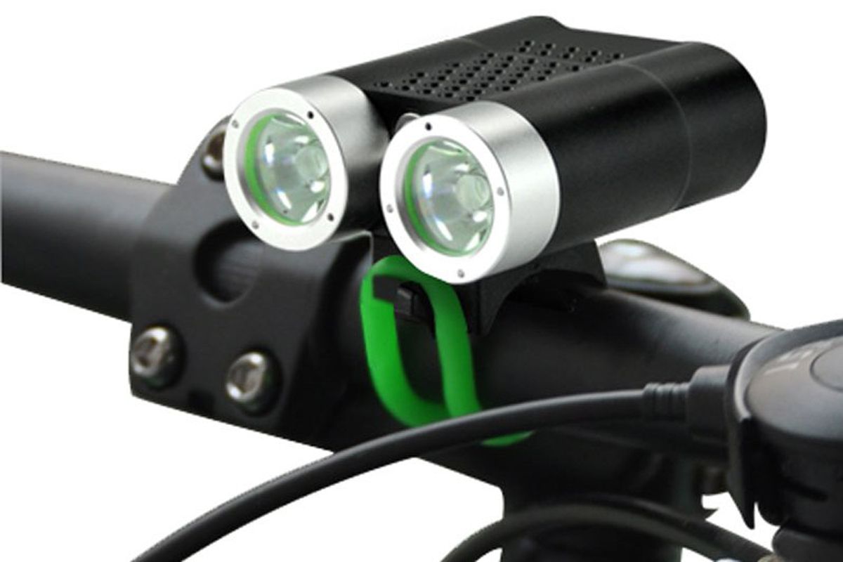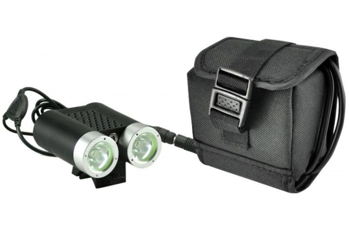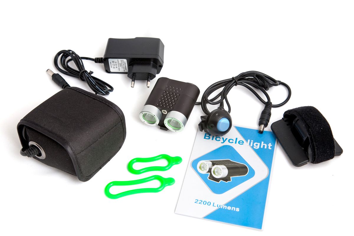 Фонарь SANGUAN SG-N2200 образует мощное равномерное освещение на расстоянии до 50 метров. Стоит отметить полное отсутствие световых границ между зонами освещения, что очень комфортно для глаз. 2 светодиода работают от выносного блока аккумуляторов (6600mAh, 7,4V) который можно заряжать от сети 220В, с помощью зарядного устройства. Сила светового потока 2200лм. 4 режима работы: 100%, 70%, 40%, 10%. Класс влагозащиты IP66. Выносная кнопка может быть размещена в наиболее удобном месте руля, длина провода кнопки около 30см. Индикатор заряда имеет три светодиода и сообщает об уровне заряда аккумулятора на уровне 100%(зелёный), 50%(синий), 10%(красный). Заряда аккумулятора 10% хватает примерно на 30 минут работы. Фонарь может быть закреплён на руль велосипеда (резиновыми хомутами), на голову велосипедиста или на шлем, с помощью налобного крепления.