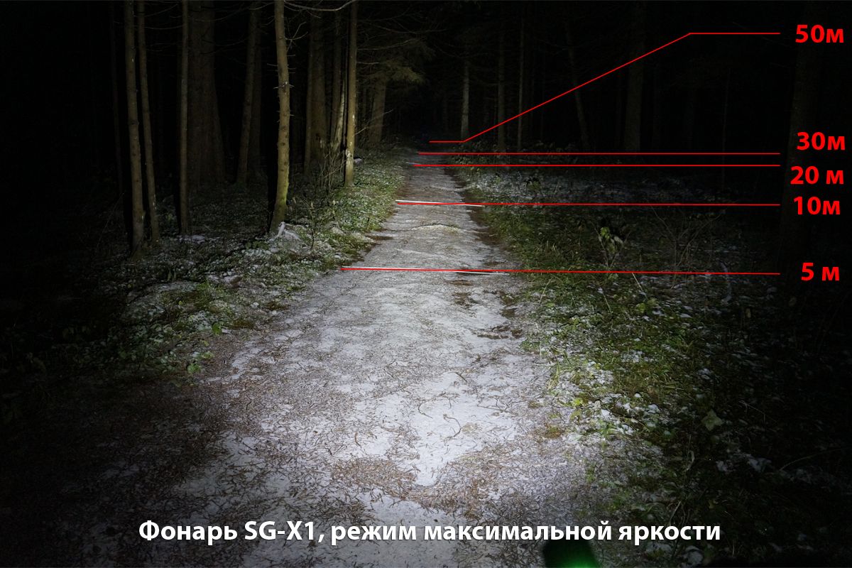 Фонарь SANGUAN SG-X1 формирует мощный пучок света силой 1000лм, хорошо освещая участок дороги до 50 метров. Отличие от фонаря SANGUAN SG-Thumb II, по эффективности освещения незначительное. Наибольшая эффективность наблюдается на расстоянии до 20 метров. При уличном освещении, перед колесом велосипеда виден ярко освещённый участок около 5 метров (подсветка ям и неровностей). Световой поток испускает один светодиод, который работает от выносного аккумулятора (2200mAh, 7,4V), заряжаемого через зарядное усройство от сети 220В. Корпус фонаря имеет хорошо развитые рёбра радиатора, чем обеспечивается лучшее охлаждение.. Фонарь может быть закреплён на руле велосипеда с помощью резиновых хомутов, а также на голове или шлеме велосипедиста, с помощью наголовного крепления (идут в комплекте). 3 светодиода, размещённые с тыльной стороны фонаря, рядом с кнопкой включения, сигнализируют о снижении заряда аккумулятора до уровня 100%, 70-50% и 20% от максимума.